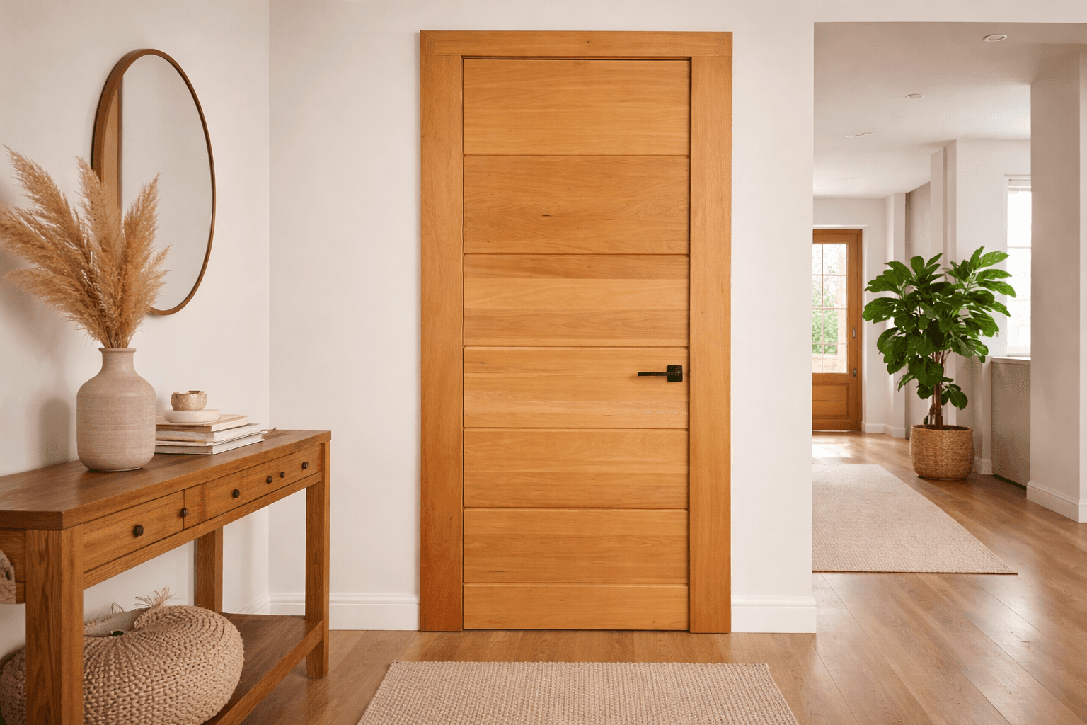 Madera clara y estable, de veta fina y aspecto uniforme. Ideal para puertas precisas y terminaciones limpias.
